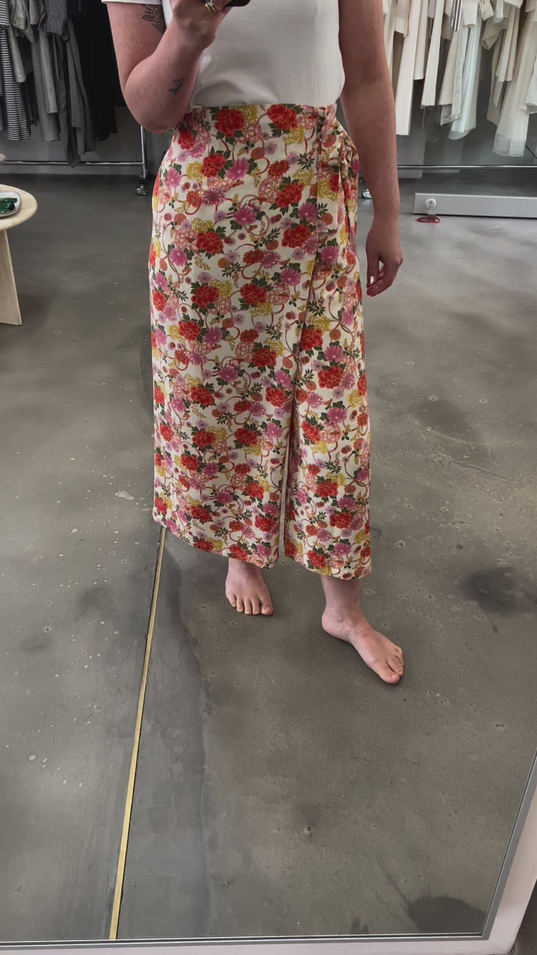 Diese Hose ist vorne gefaltet und in der Taille gewickelt. Sie können die Taille daher durch Wickeln anpassen. Mit Taschen an den Seiten und falschen Leistentaschen hinten.