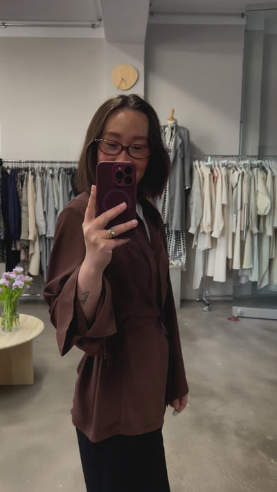 The Ribbon Blouse is a new design piece. It can be tied with two fabric ribbons into a delicate bow or left open for a relaxed, draped effect that highlights the fabric.
